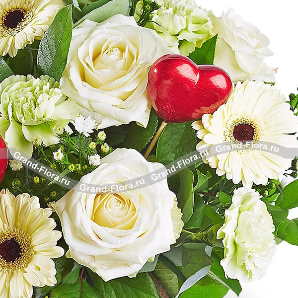 Люкс: роза белая - 7 шт., гербера кремовая - 5 шт., гвоздика зеленая - 3 шт., рускус - 2 шт., гипсофила - 1 шт., эвкалипт - 2 шт., сердце красное (декоративное) - 3 шт., упаковка, бант красный. Примерный размер: 35Х35 см.